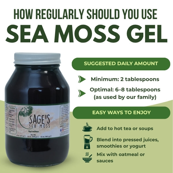 Sea Moss is best incorporated as a daily natural multivitamin, we suggest a minimum of 2 tablespoons or more for optimal benefits. Our family personally enjoys upwards of 6-8 TBS daily in hot tea, soups, pressed juice, yogurt etc.