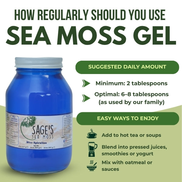 Sea Moss is best incorporated as a daily natural multivitamin, we suggest a minimum of 2 tablespoons or more for optimal benefits. Our family personally enjoys upwards of 6-8 TBS daily in hot tea, soups, pressed juice, yogurt etc.