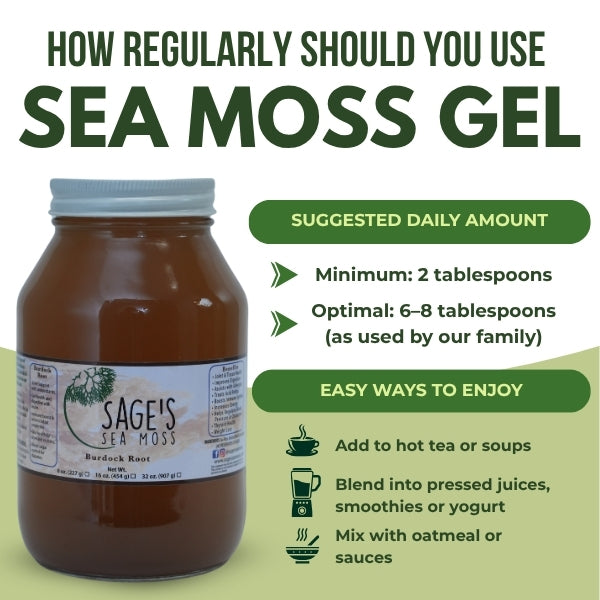 Sea Moss is best incorporated as a daily natural multivitamin, we suggest a minimum of 2 tablespoons or more for optimal benefits. Our family personally enjoys upwards of 6-8 TBS daily in hot tea, soups, pressed juice, yogurt etc.