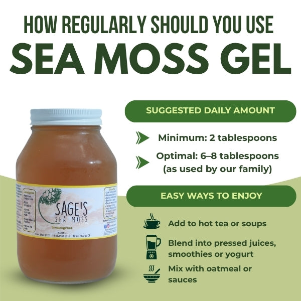 Sea Moss is best incorporated as a daily natural multivitamin, we suggest a minimum of 2 tablespoons or more for optimal benefits. Our family personally enjoys upwards of 6-8 TBS daily in hot tea, soups, pressed juice, yogurt etc.