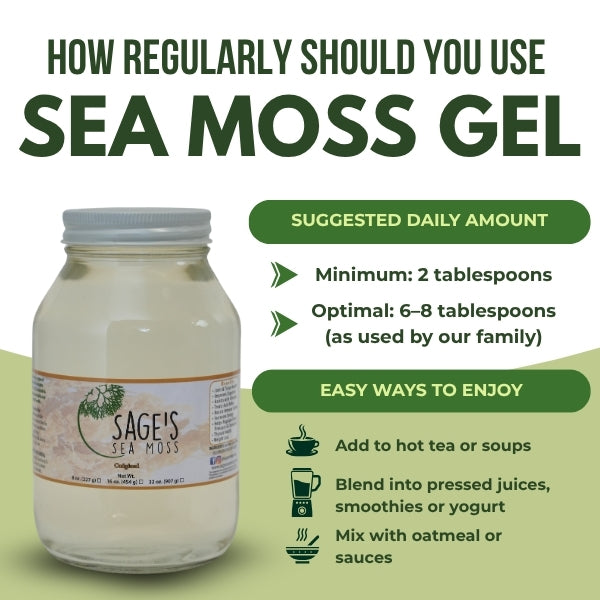Sea Moss is best incorporated as a daily natural multivitamin, we suggest a minimum of 2 tablespoons or more for optimal benefits. Our family personally enjoys upwards of 6-8 TBS daily in hot tea, soups, pressed juice, yogurt etc.